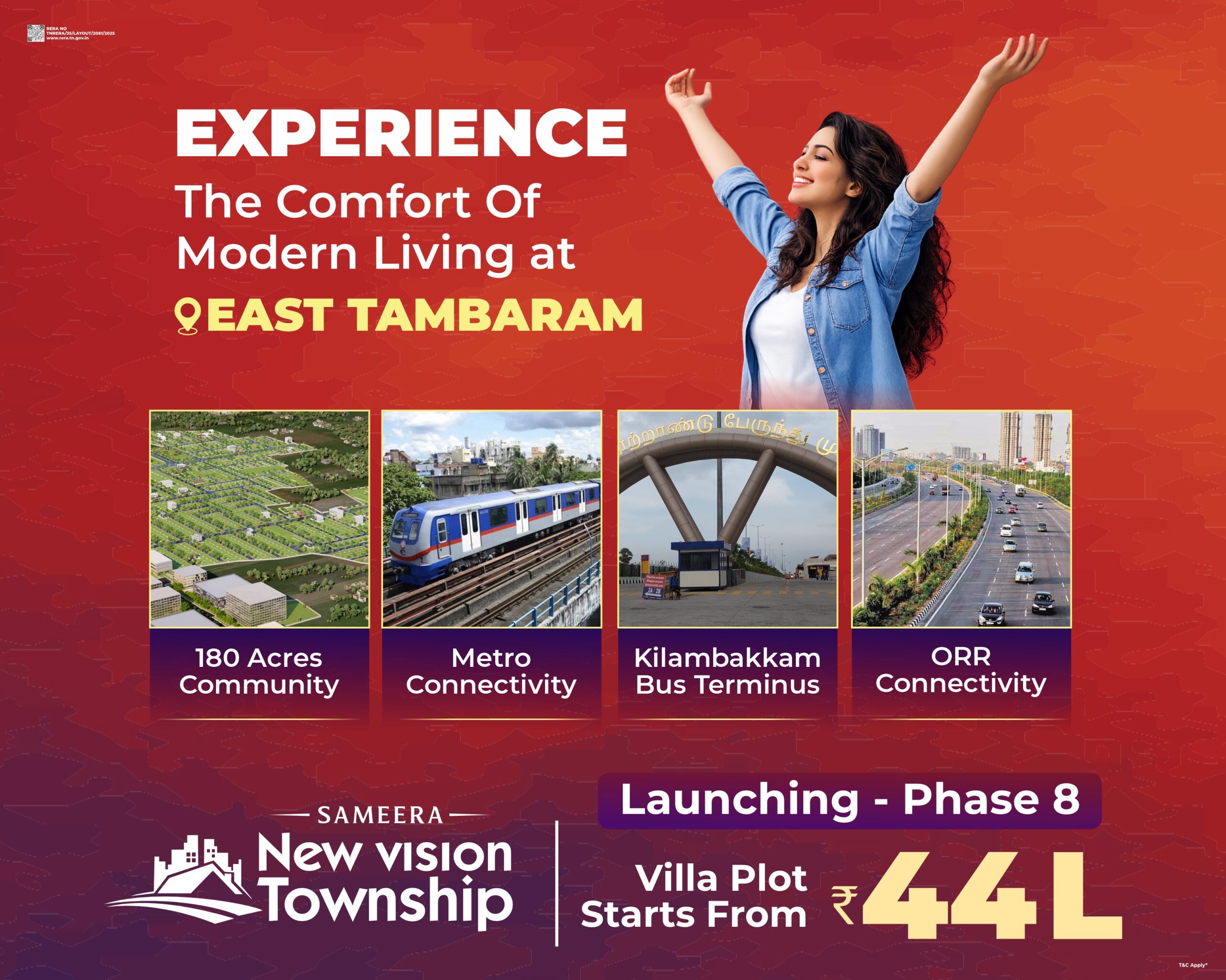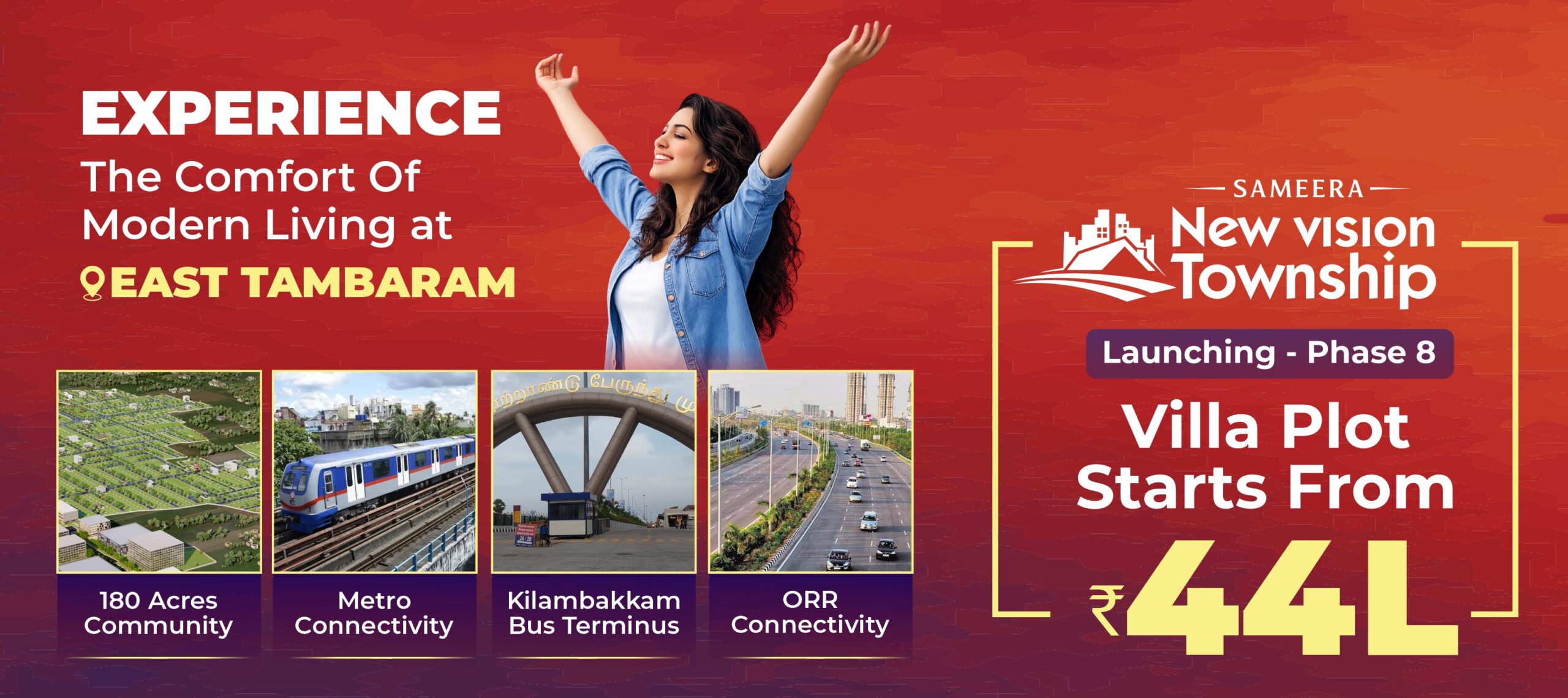 Sameera New Vision Township is a landmark plotted development located in the fast-growing corridor of East Tambaram, designed to offer a perfect balance of modern living and long-term investment value. Spread across a vast, well-planned landscape, the township brings together thoughtfully designed plots, wide internal roads, green open spaces, and essential infrastructure to create a secure and vibrant community.